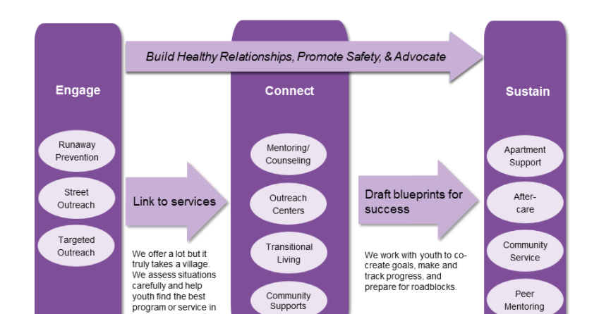 We Engage with Runaway Prevention, Street & Community Outreach, and by targeting Outreach areas. We then focus on linking young adults to services. We offer a lot, but it truly takes a village. We assess situations carefully and help young adults find the best self-development approaches through programs and services in our local communities.